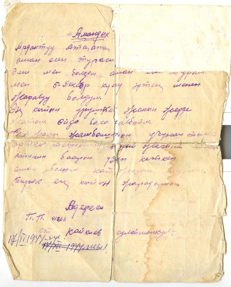 А вот младший брат Сулайманкул, 1921 года рождения, на фронт ушел первым, воевал под Киевом и Сталинградом. Был смертельно ранен и умер в госпитале. Примерно в декабре 1943 года. От него осталось одно почти истлевшее письмо, где он пишет домой о своем тяжелом ранении.