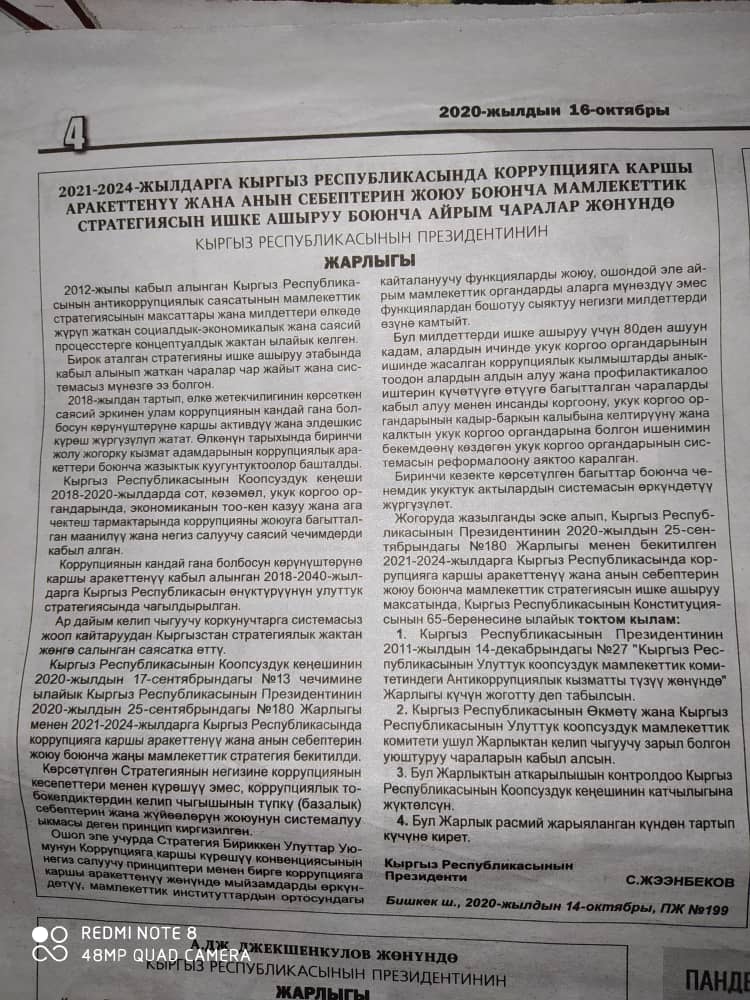 Уточняется, что документ подписал 14 октября еще действующий на тот момент президент Сооронбай Жээнбеков.