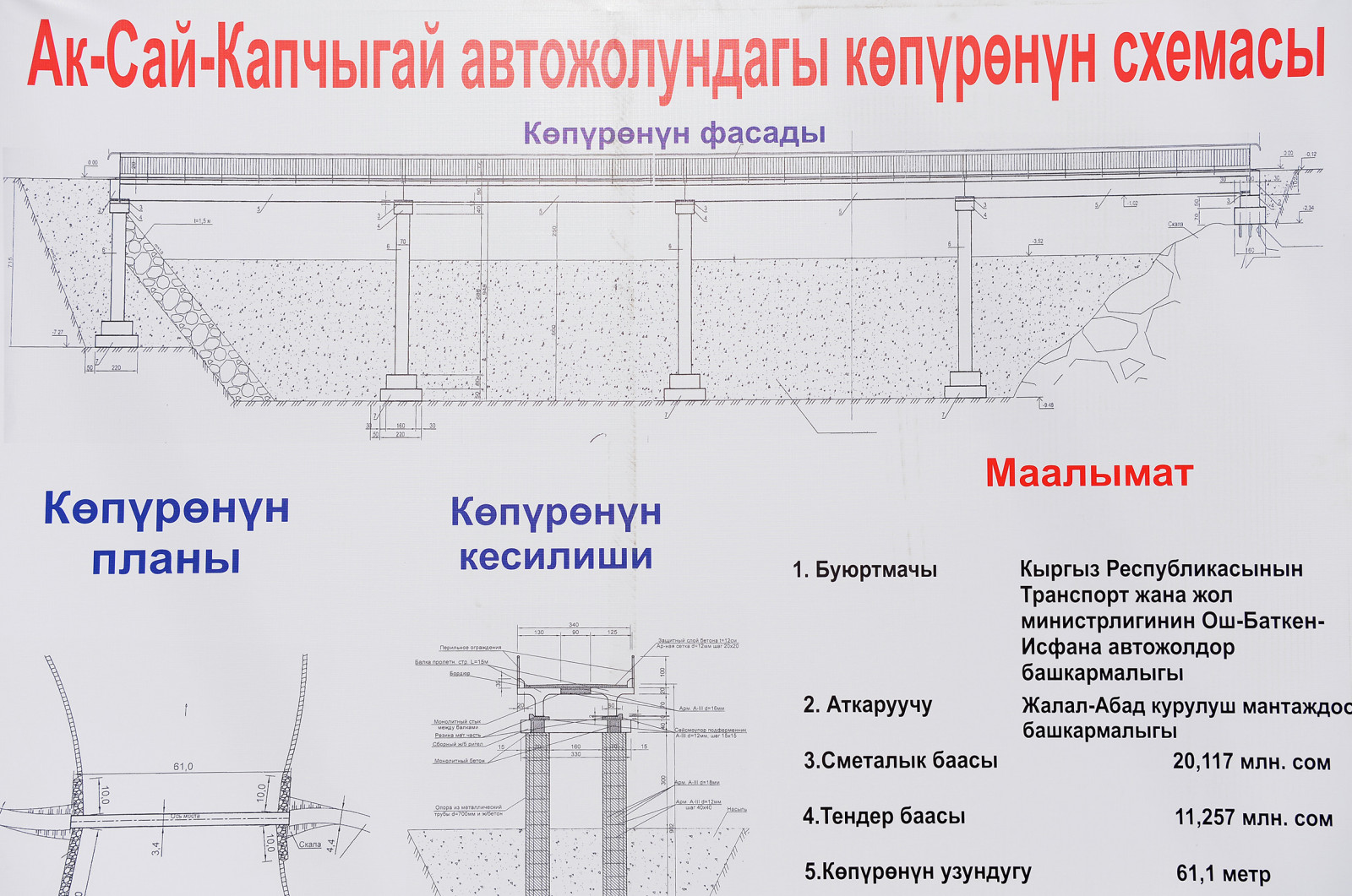 Он также проинспектировал строительство моста между селами Ак-Сай и Капчыгай. Министр транспорта и дорог Бакыт Бердалиев отметил, что работы планируется завершить к концу 2020 года.