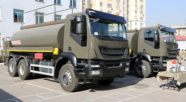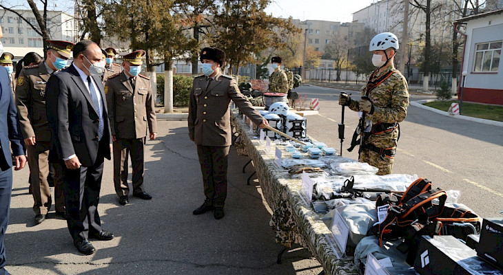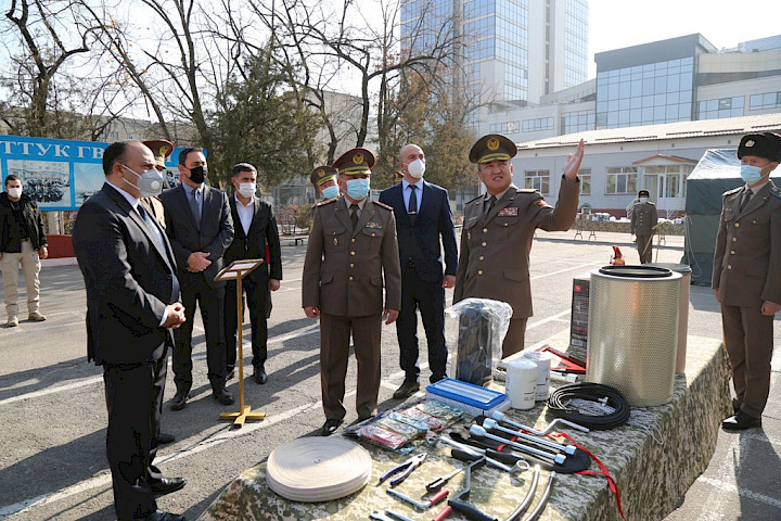 После обсуждения двустороннего сотрудничества прошла официальная церемония приема-передачи военного вещевого имущества, горного снаряжения и автомобильной техники для военнослужащих Кыргызстана.