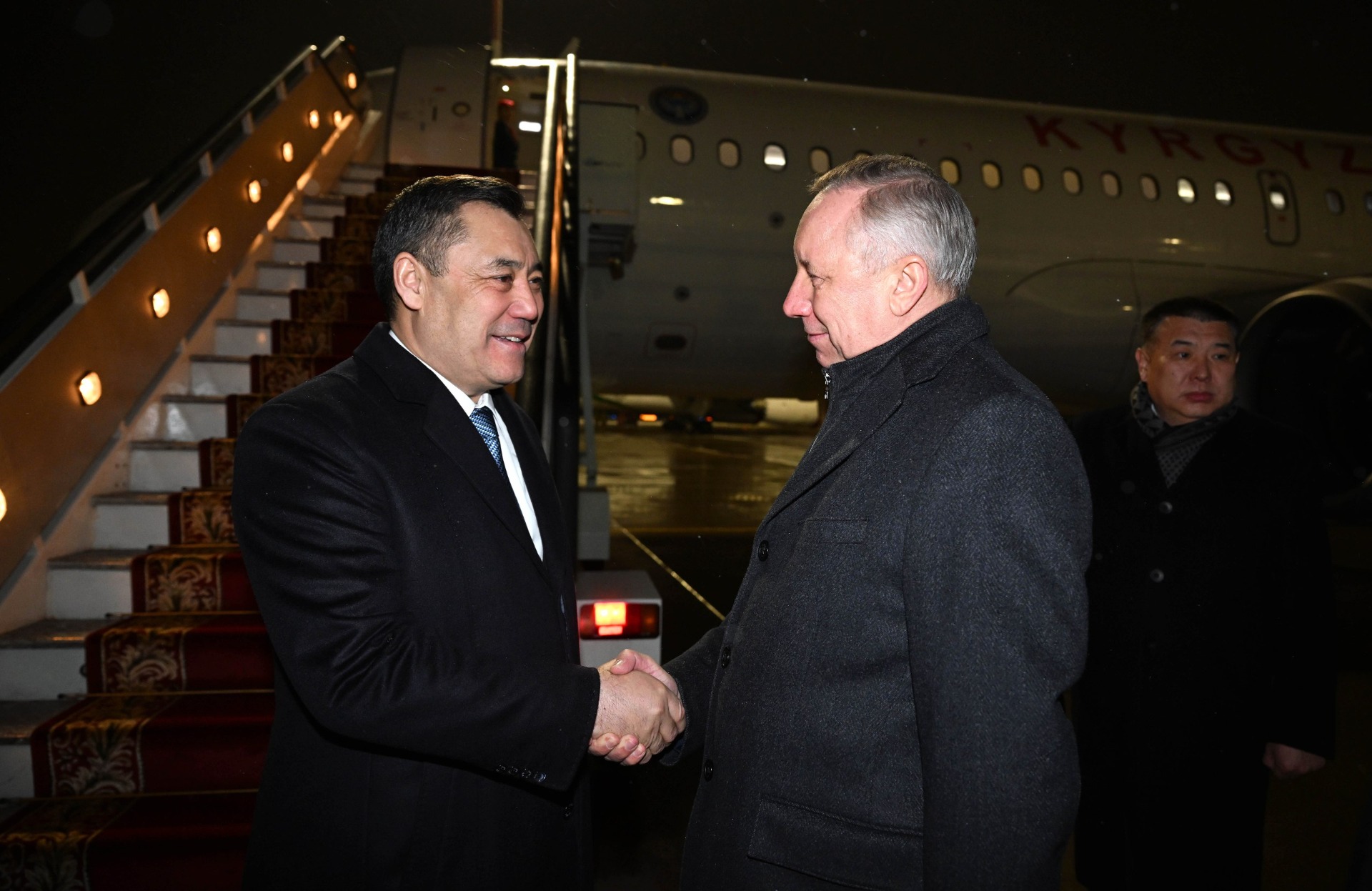 Президент Садыр Жапаров 24 декабря прибыл с рабочим визитом в Санкт-Петербург. Самолет главы государства приземлился в аэропорту «Пулково», где его встретили заместитель губернатора Санкт-Петербурга Олег Эргашев и другие официальные лица.