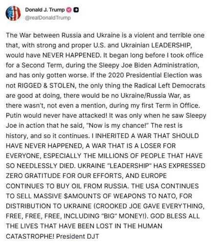 «Война между РФ и Украиной жестокая и ужасная, и при сильном и правильном руководстве США и Украины она бы НИКОГДА НЕ НАЧАЛАСЬ. Она началась задолго до того, как я вступил в должность на второй срок, при администрации сонного Джо Байдена, и становилась только хуже. Если бы президентские выборы 2020 года не были сфальсифицированы и украдены — единственное, что радикальные левые демократы умеют делать хорошо, — то не было бы никакой войны Украины и России, как и не было даже упоминаний о ней в течение моего первого срока», — высказался он.