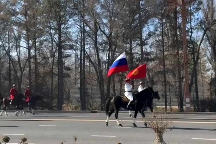 На кадрах, опубликованных пользователями соцсетей, видно, как всадники в национальной форме отрабатывают синхронный парадный проход. Один из них держит государственный флаг Кыргызстана, другой — флаг Российской Федерации. Репетиция стала частью подготовки к протокольной встрече высокого гостя.