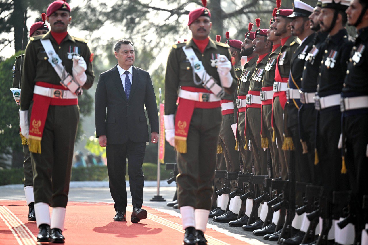 Командир почетного караула представил приветственный рапорт, после чего Садыр Жапаров в сопровождении командира прошел по ковровой дорожке. Затем лидеры двух стран обменялись короткими приветствиями с членами официальных делегаций.