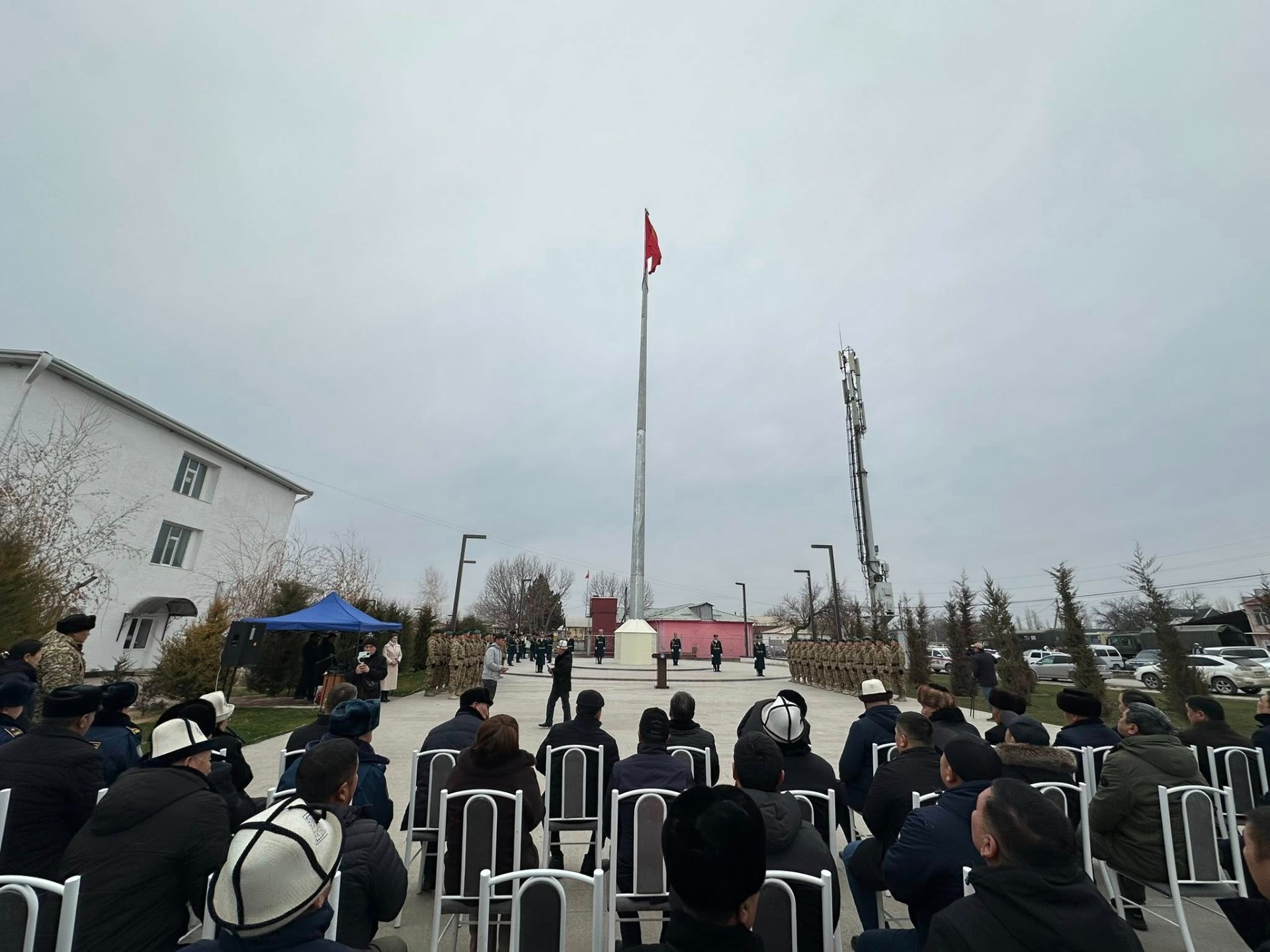 В Баткене состоялась торжественная церемония поднятия государственного флага Кыргызской Республики. Стяг поднят на флагштоке высотой 35 метров под сопровождением военного оркестра, сообщила мэрия города.
