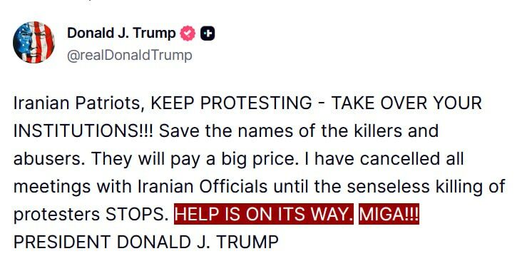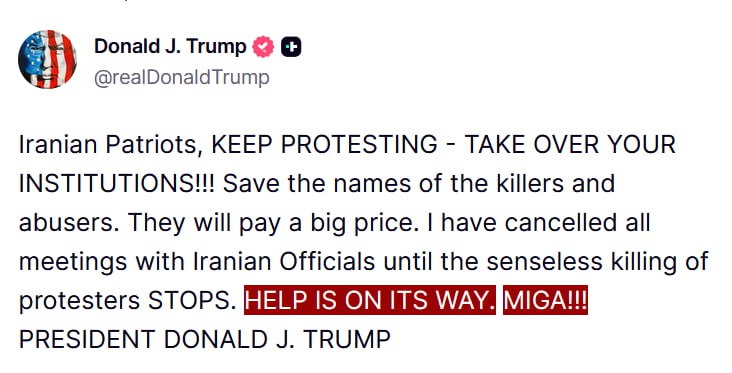 «Иранские патриоты, продолжайте протесты — захватывайте свои органы власти! Сохраняйте имена убийц и насильников. Они заплатят высокую цену. Я отменил все встречи с иранскими официальными лицами, пока не прекратится бессмысленное убийство протестующих. Помощь в пути. Сделаем Иран великим снова», — написал глава Белого дома в своей соцсети Truth Social.