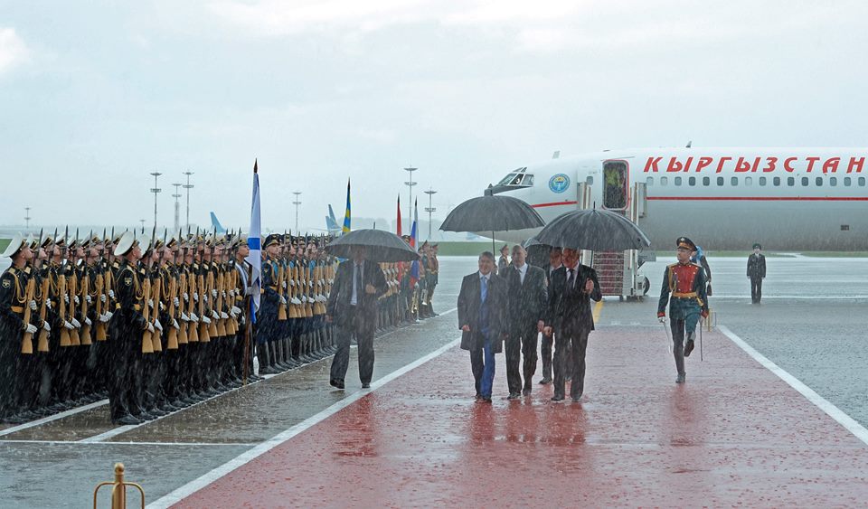Президент Кыргызстана прибыл в Москву в рамках государственного визита. Главу государства встречал почетный караул трех видов вооруженных сил Московского гарнизона. У трапа самолета Алмазбека Атамбаева приветствовали глава Федеральной таможенной службы России Владимир Булавин, замминистра иностранных дел РФ Григорий Красин, Чрезвычайный и Полномочный Посол России в Кыргызстане Андрей Крутько и директор Департамента государственного протокола МИД РФ Юрий Филатов.