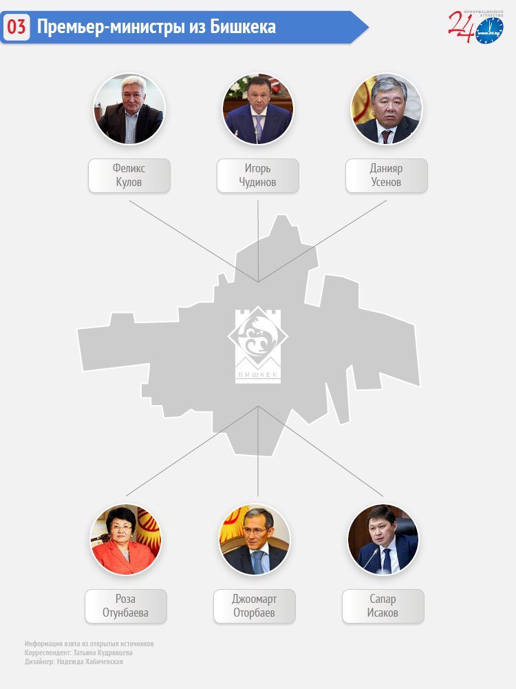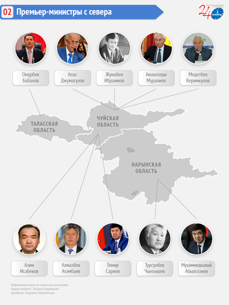 Примечательно, что выходцев с севера Кыргызстана среди глав кабминов больше — 13 человек. Причем все они из Чуйской области. Самые богатые на премьеров — Бишкек и село Арашан, малая родина экс-президента Кыргызстана Алмазбека Атамбаева.