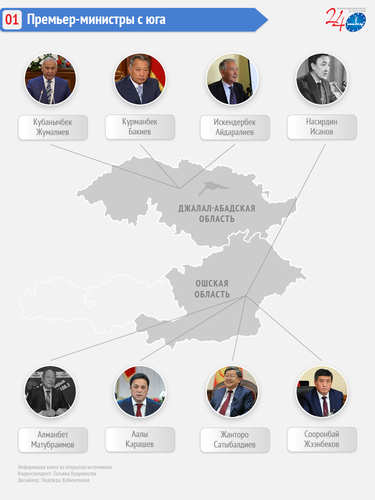 Среди премьер-министров на сегодня восемь — выходцы из южных областей. Один из Таласской области (Омурбек Бабанов) и двое из Нарынской (Турсунбек Чынгышев и Мухаммедкалый Абылгазиев). Пять премьеров родились в Ошской области, а трое — в Джалал-Абадской.