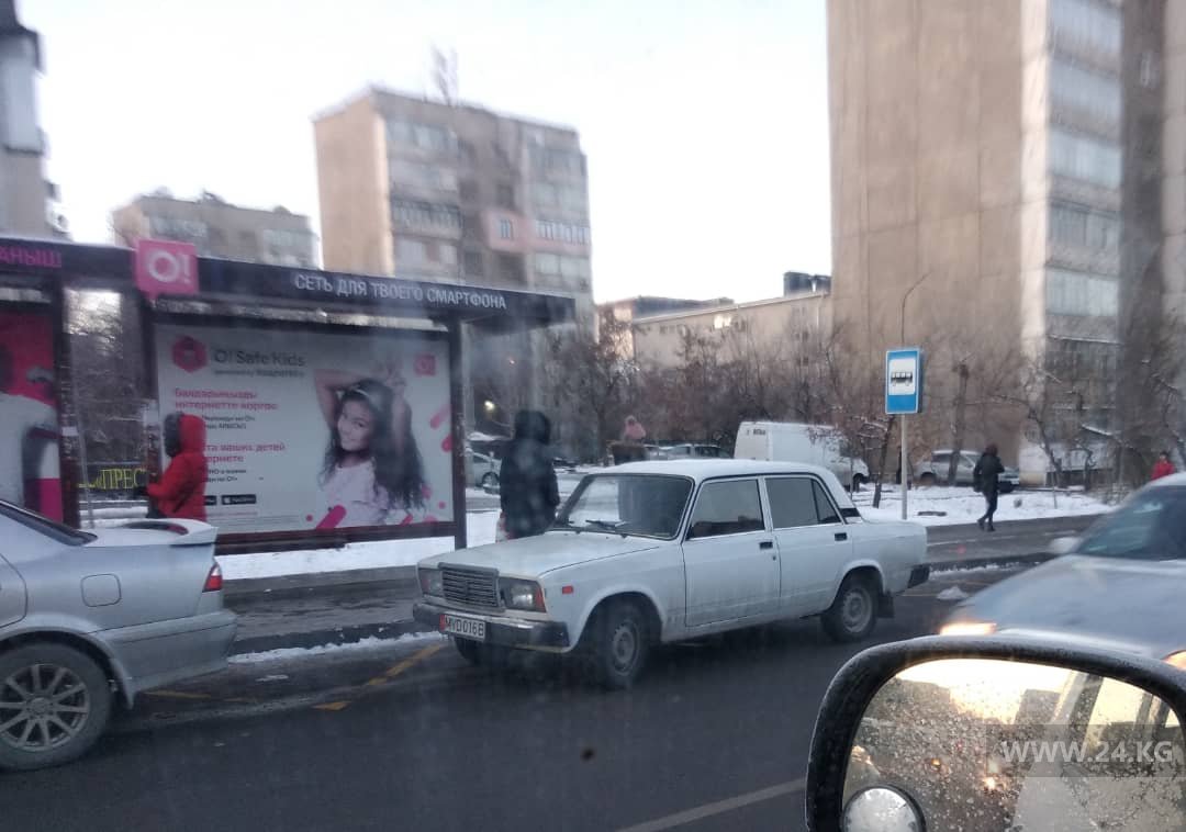 На остановке в районе перекрестка улиц Суеркулова и Юнусалиева стояла легковушка с госномером МВД Кыргызстана.