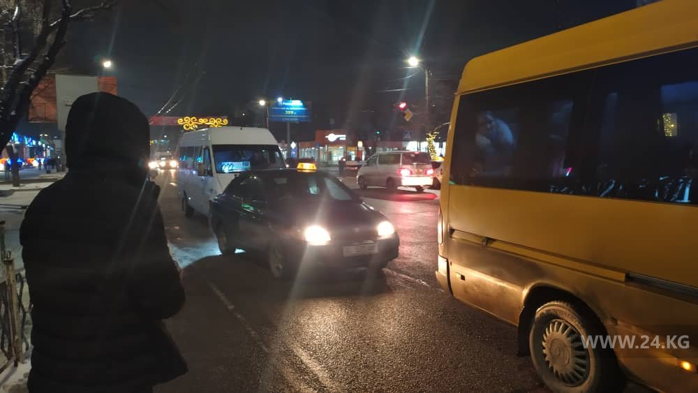 Таксист перед остановкой на проспекте Чуй встал на перекрестке, мешая проезду.