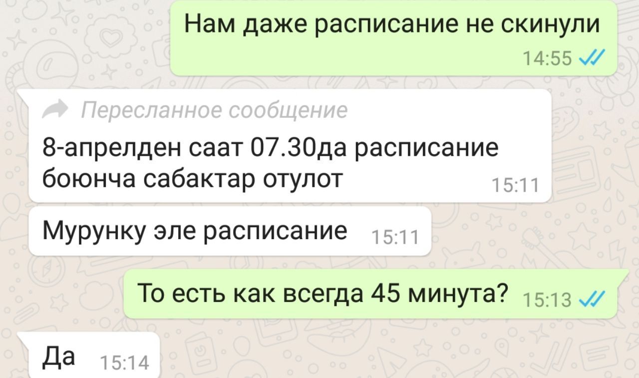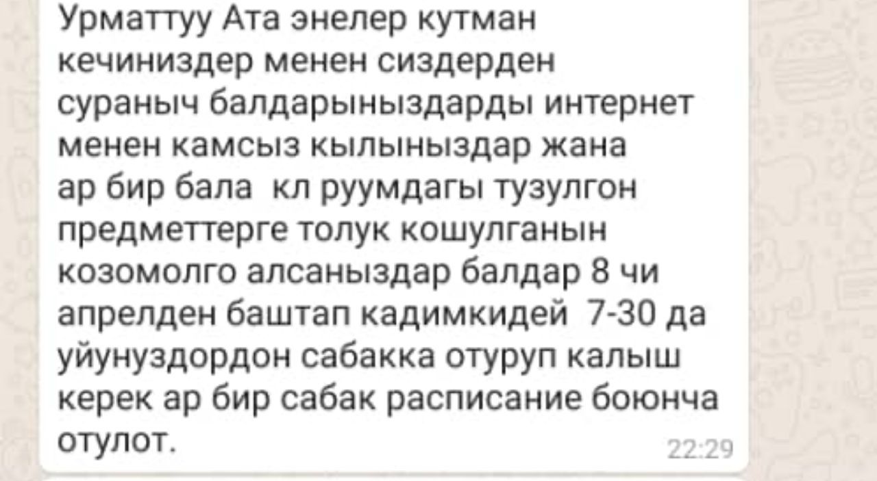 В Бишкеке в школе № 69 имени Токтогула Сатылганова онлайн-уроки длятся по 45 минут, а не по 20, как говорили в Министерстве образования. Об этом 24-kg.com сообщила читательница.