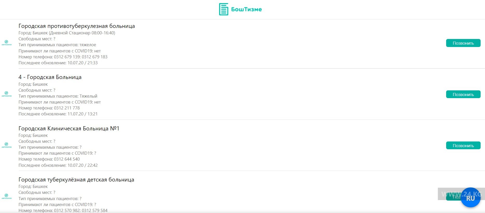На сайте «БошТизме» невозможно найти свободные места в больницах. Об этом сообщают волонтеры, которые помогают медикам в стационарах и медучреждениях.