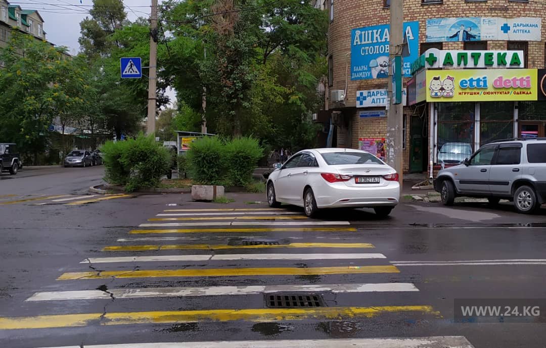 С нарушением Правил дорожного движения припарковался и этот автолюбитель. На перекрестке улиц Шопокова и Боконбаева он заехал на разметку пешеходного перехода.