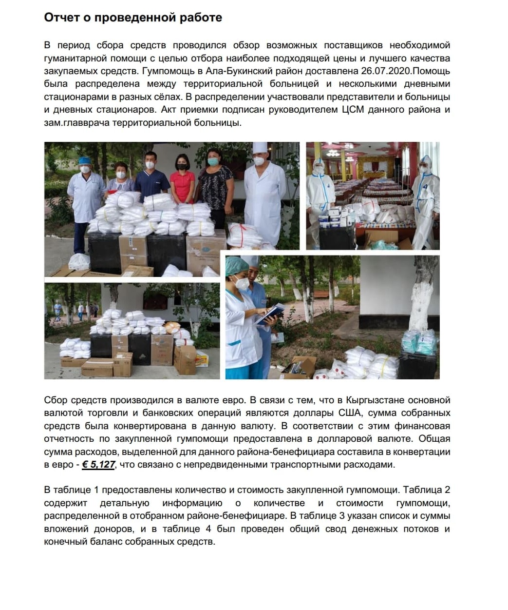 «Из-за того, что мы не в курсе об оснащенности больниц в Кыргызстане и полной картины о ситуации в регионах, решение принимали на основе информации от медиков и экспертов. Заявки получили напрямую из больниц и медучреждений республики. Для начала мы отправили помощь Ала-Букинской территориальной больнице. Врачи и медперсонал района были очень тронуты нашим вниманием. Мы надеемся, что оказанная помощь даст возможность им преодолеть волну COVID-19», — рассказывает собеседница.