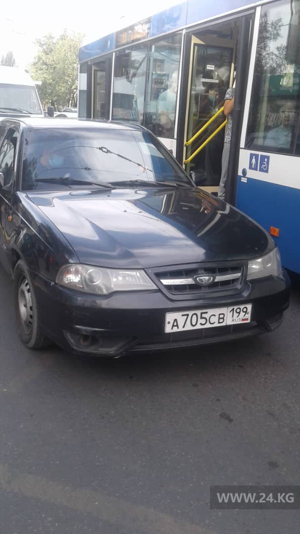 Чудаки парковки встали «паровозиком» на остановке на перекрестке проспекта Манаса и улицы Боконбаева. Троллейбус так и не смог подъехать ближе к бордюру.