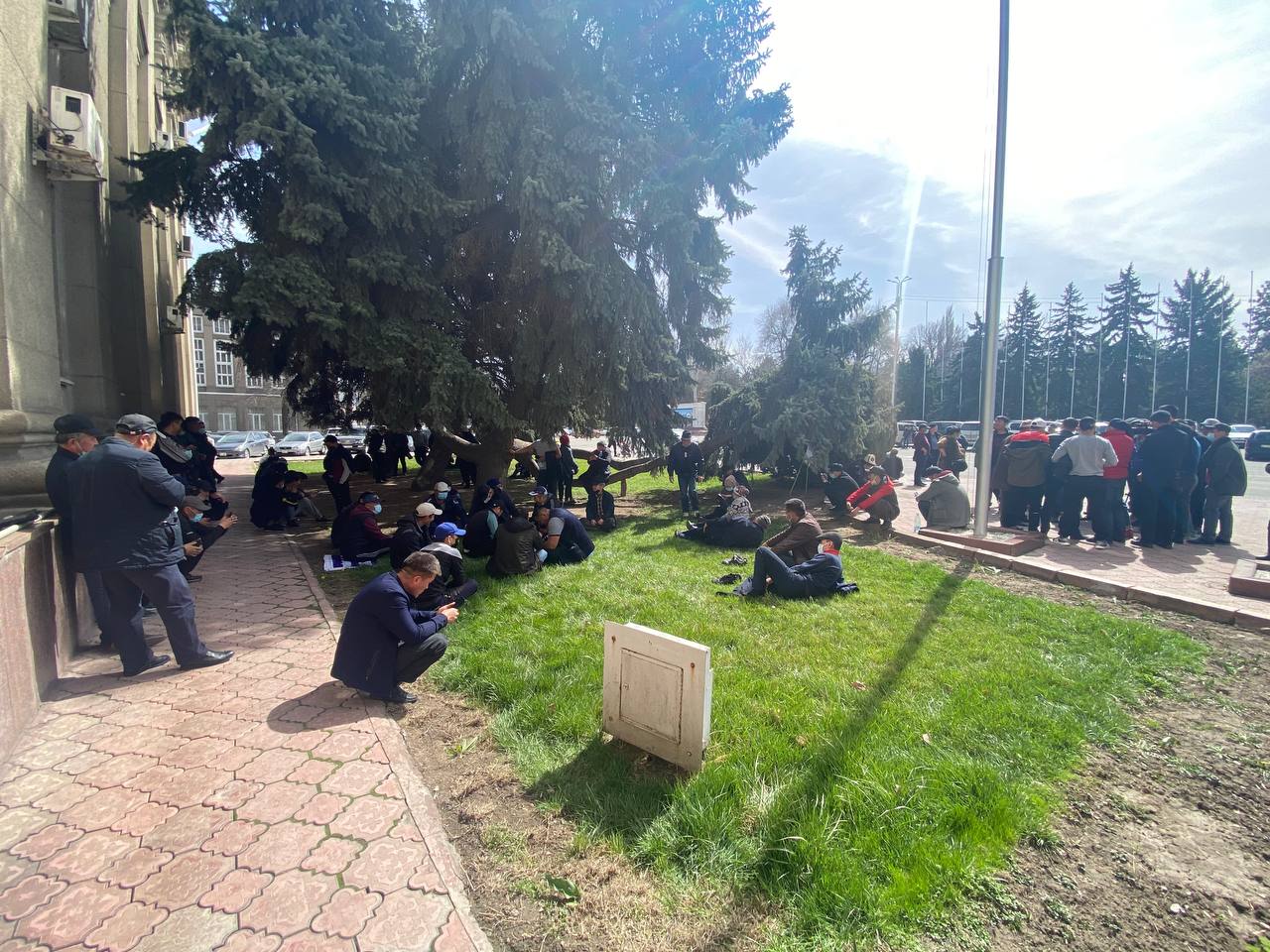 Митингующие ждут, когда к ним выйдут чиновники из Дома правительства. Некоторые из них расположились прямо на газоне. Об этом 24-kg.com сообщил читатель.