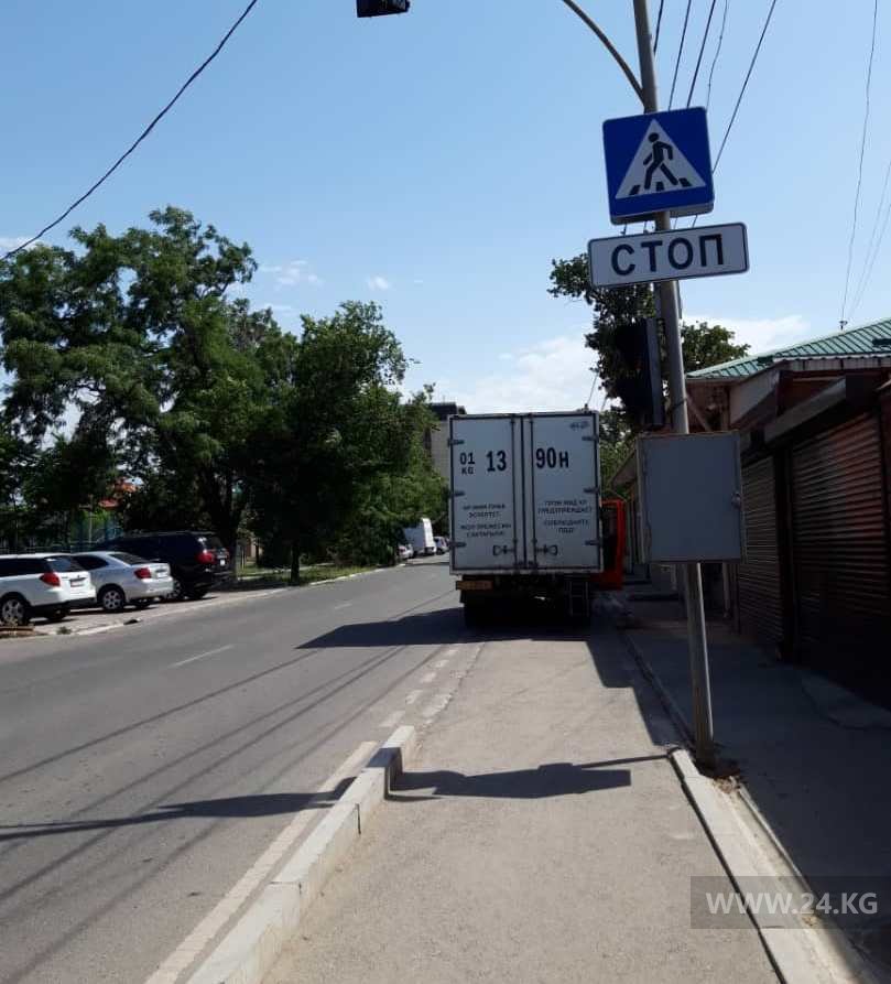 В Бишкеке грузовик заехал на пешеходную дорожку на улице Фатьянова. Людям пришлось выходить на дорогу, чтобы его обойти.
