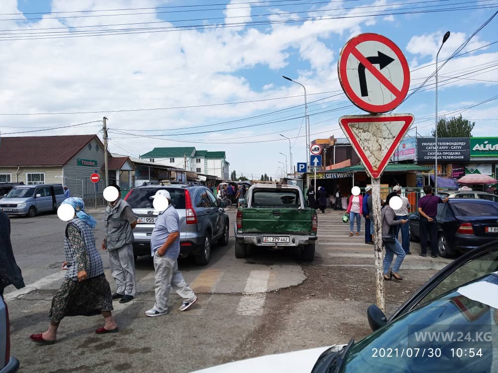 На тротуаре, да еще и на разметке пешеходного перехода, встали и владельцы этих авто в Оше.