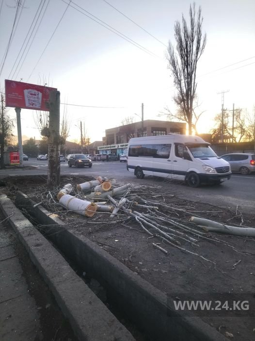 В Бишкеке на улице Юнусалиева рабочие «Зеленстроя» срубили живые тополя. Об этом 24-kg.com сообщила читательница.