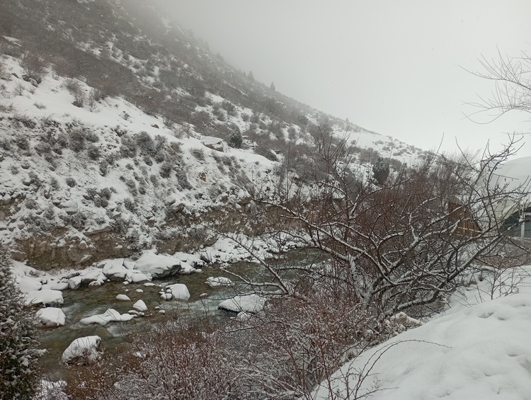 Сначала отправимся в начало марта этого года. Тогда погода была совсем зимней. Что и видно на фотографиях Майрам Буркутовой, которые она сделала в Аламединском ущелье.