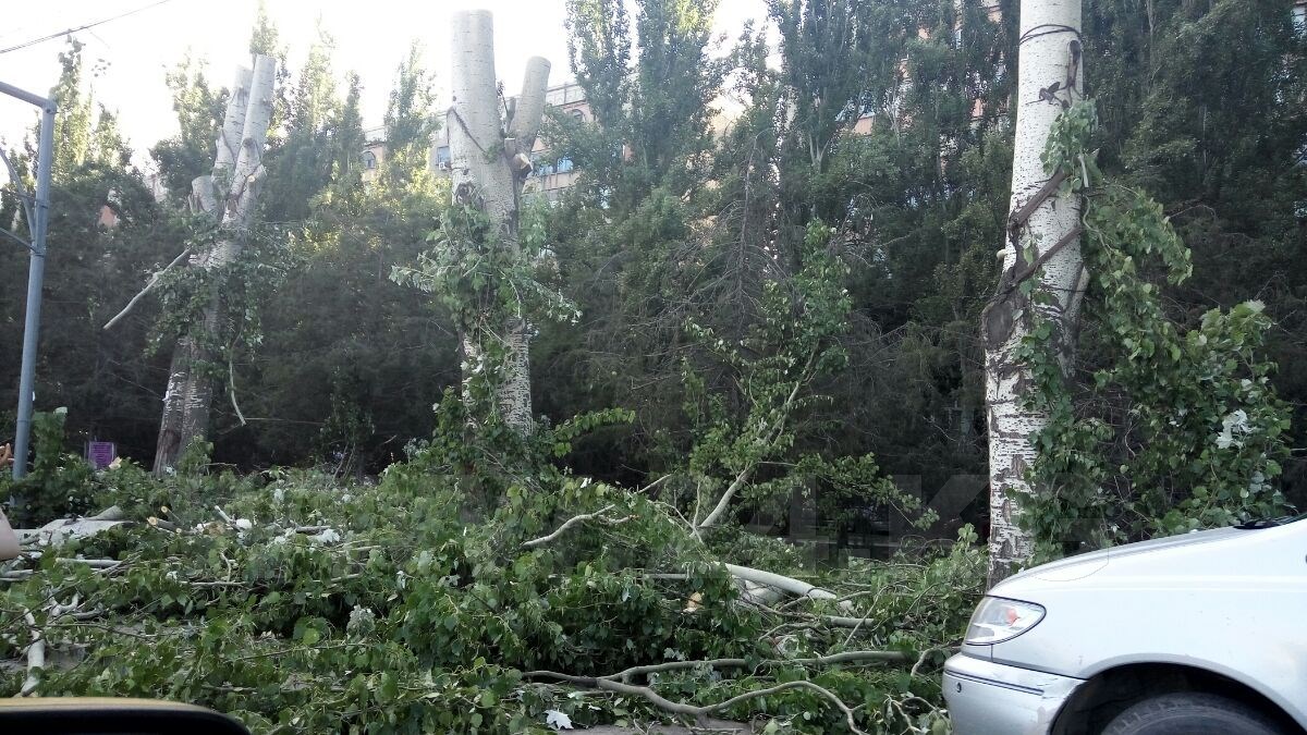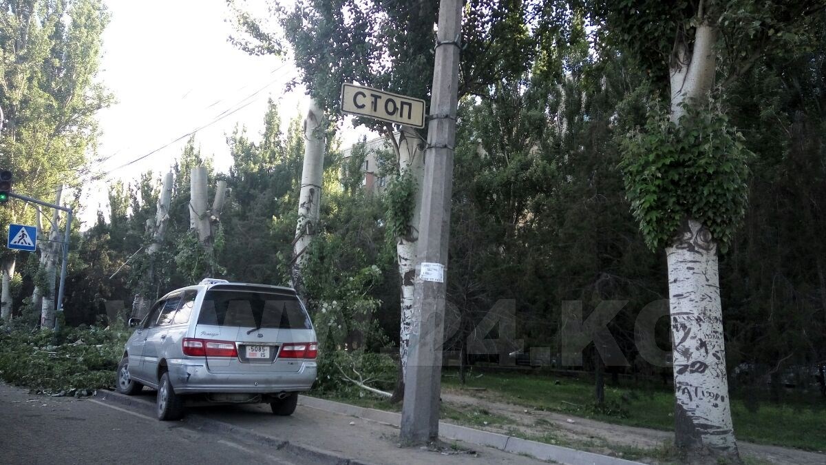 Обрубка деревьев производится на пересечении улиц Курманджан датки и Мамбетова. Деревья не срубают под корень, а спиливают ствол наполовину.