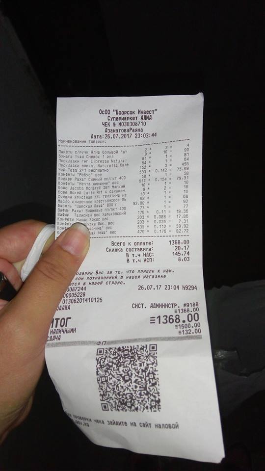 «Около 400 сомов нам вернули через 1,5 часа разборок из-за 20-сомовых вафель, которые мы якобы покупали, и чая, пробитого 3 раза (плюс бонусные хлебцы из-под стола кассирши). Деньги деньгами, а вот время и нервы уже не вернешь», — написала Нуржамал Джаныбекова и посоветовала горожанам быть бдительными и проверять чеки.