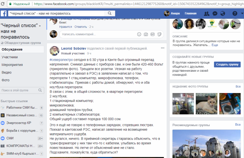 В результате перепада напряжения у жителя Канта перегорела бытовая техника на общую сумму около 100 тысяч сомов. Об этом сообщил пользователь социальной сети Facebook Леонид Соболев.