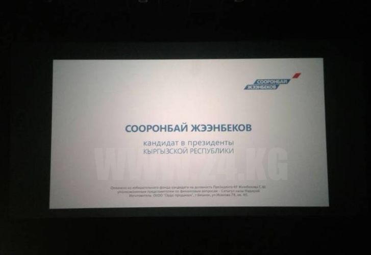 В день тишины, который традиционно объявляют накануне выборов, прекращаются все виды агитации за того или иного кандидата. Так положено по закону. Однако в Бишкеке в кинотеатре «Россия» в зале №1 перед началом фильма «Салют-7» (сеанс в 13.50) крутили два ролика в пользу кандидата на пост президента Сооронбая Жээнбекова. Об этом ИА «24.kg» сообщили читатели.