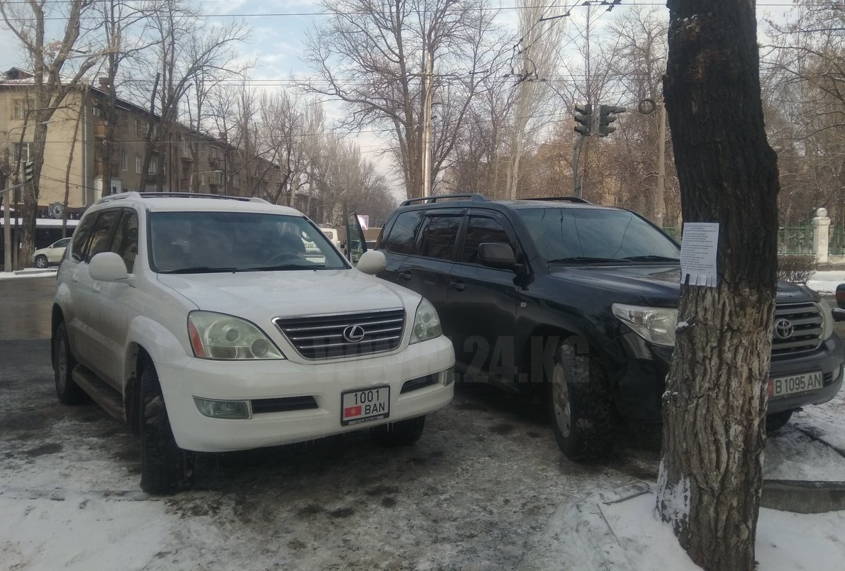 На пешеходном переходе на пересечении улиц Московской и Т.Молдо припаркованы два внедорожника — Лексус» (госномер 1001BAN) и «Тойота» (госномер B1095AN).