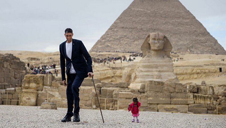Компанию «турецкому великану» составила Джоти Амджи из Индии, признанная компанией Guinness World Records «самой маленькой женщиной в мире» за рост в 62 сантиметра. Рекордсмены поучаствовали в фотосессии для привлечения туристов к египетским достопримечательностям.