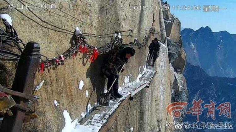 С одной стороны — отвесная скала, с другой — пропасть, на небесном мосту на горе Хуашань в Китае помещается лишь один человек, который лопатой расчищает путь. Об этом пишет газета «Жэньминь жибао».