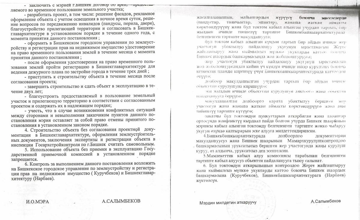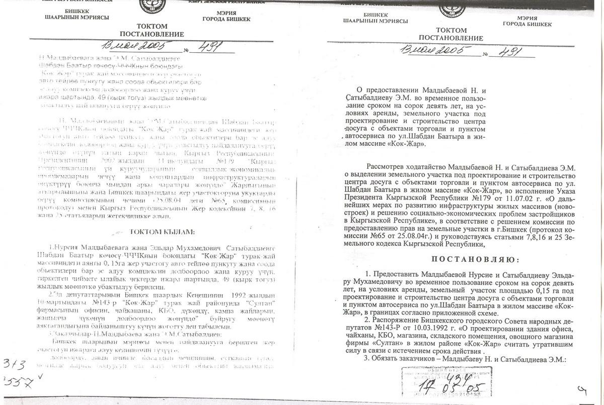 Как рассказали в мэрии, участок в 15 соток выдан в долгосрочную аренду на 49 лет. По постановлению от 13 мая 2005 года №491 земля предоставлена не компании, а гражданам Малдыбаевой и Сатыбалдиеву под центр досуга, торговли и автосервиса. Территория не подлежит крупной застройке, коммуникаций на участке нет. Идет 100-процентное нарушение функционального назначения земли. Более того, владельцы задолжали за аренду 300 тысяч сомов. С подачи ИА «24.kg» мэрия намерена подать на проходимцев в суд.