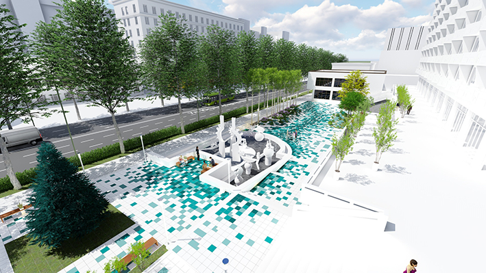 Сейчас, по сообщениям БГА, озеленение у фонтана неудовлетворительное. Для сохранения двух существующих берез проектом предложена рядовая посадка новых. Они будут защищать от солнечных лучей, создавать тень на тротуаре и рекреационной части территории.