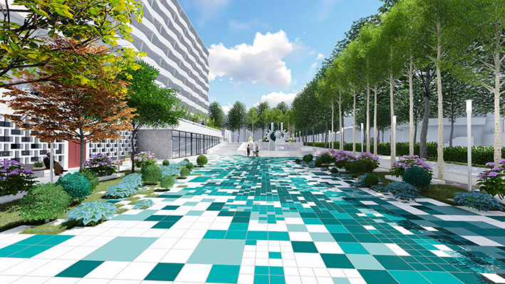 Для художественной выразительности архитектуры здания выполнят декоративное мощение, имитирующее волну, с применением напольного освещения.