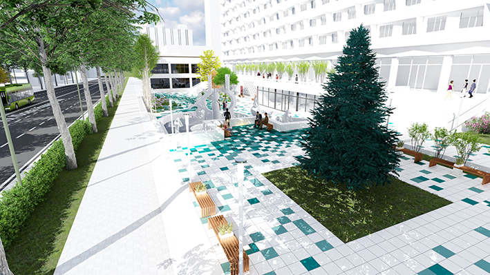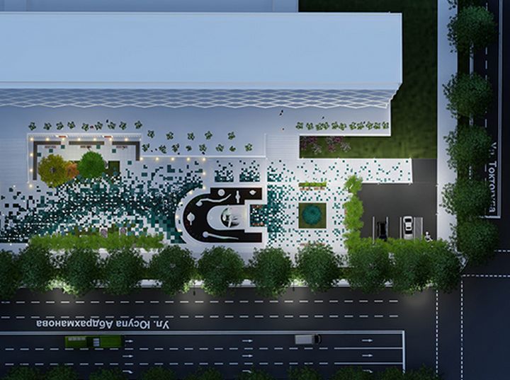 Предусмотрены устройство площадок и мест уединенного отдыха, организация пешеходной зоны для прогулок и подходов к жилым домам и магазинам, полноценное озеленение всей территории на пересечении улиц Абдрахманова и Токтогула.
