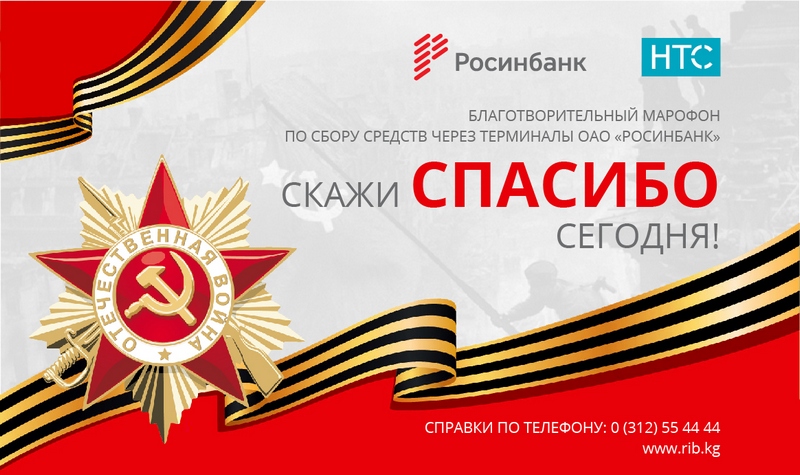 В честь 70-летия со дня Великой Победы ОАО «Росинбанк» приглашает всех кыргызстанцев принять участие в благотворительном марафоне по сбору средств для ветеранов Великой Отечественной войны «Скажи СПАСИБО сегодня». Проект организован совместно с телекомпанией НТС и несколькими банками республики.