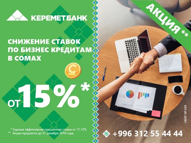 Если вы бизнесмен и в поиске источников финансирования капитальных затрат или пополнения оборотных/основных средств, успейте воспользоваться сниженными процентными ставками по бизнес-кредиту «Деловой рост» от «Керемет Банка» — до 15 процентов годовых в сомах!