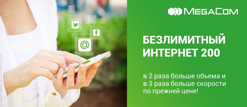 «Теперь объем трафика на максимальной скорости составляет не 100, а 200 мегабайт, соответственно чуть поменялось и само название опции, теперь это «Безлимитный Интернет 200». Для еще большего удобства абонентов скорость мобильного Интернета выше установленного порога увеличена в 3 раза до 192 Кбит/с, при этом стоимость абонентской платы осталась прежней – 30сом./день», - поясняет руководитель отдела маркетинга компании MegaCom Михаил Лехтман.