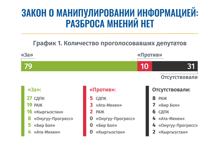 3 августа 2020 года президент Сооронбай Жээнбеков отправил закон «О манипулировании информацией» на доработку в Жогорку Кенеш.