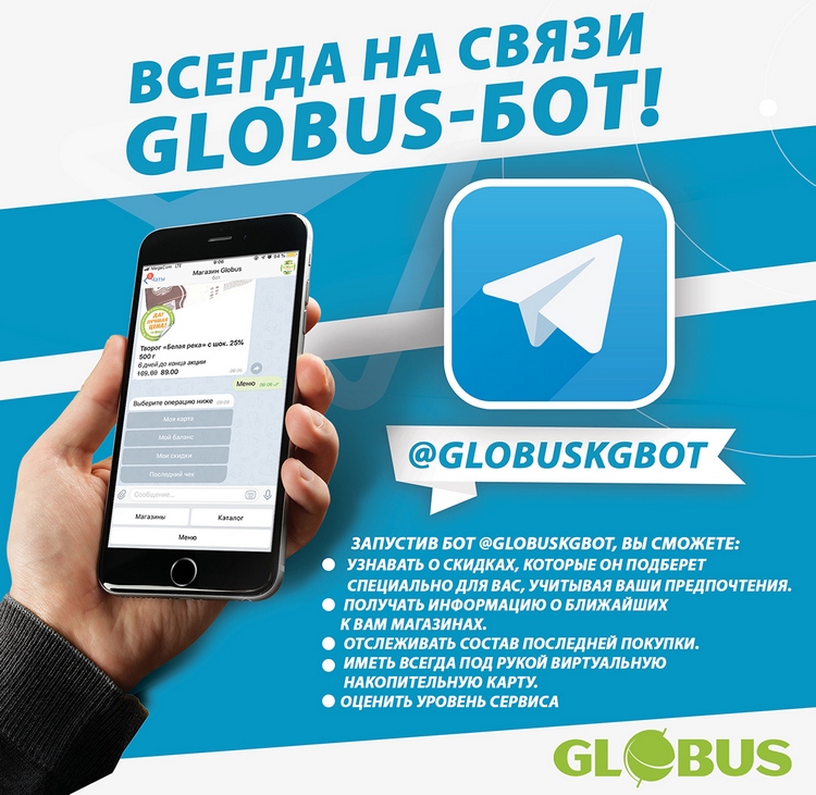 Знакомьтесь — Telegram-бот магазина Globus. Простой и быстрый ассистент поможет вам экономить время и деньги, делая покупки в сети магазинов Globus.