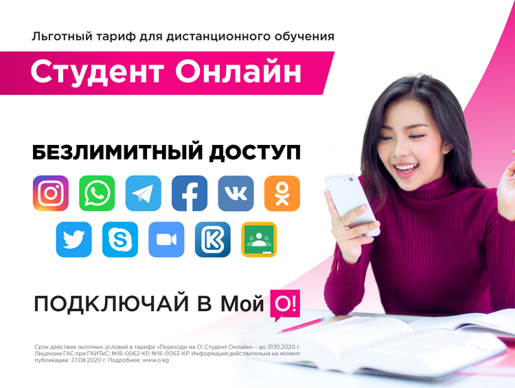 БЕЗЛИМИТНЫЙ ИНТЕРНЕТ-ТРАФИК на образовательные сайты вузов КР, Zoom, Skype, Google Classroom, KelВil, а также на: