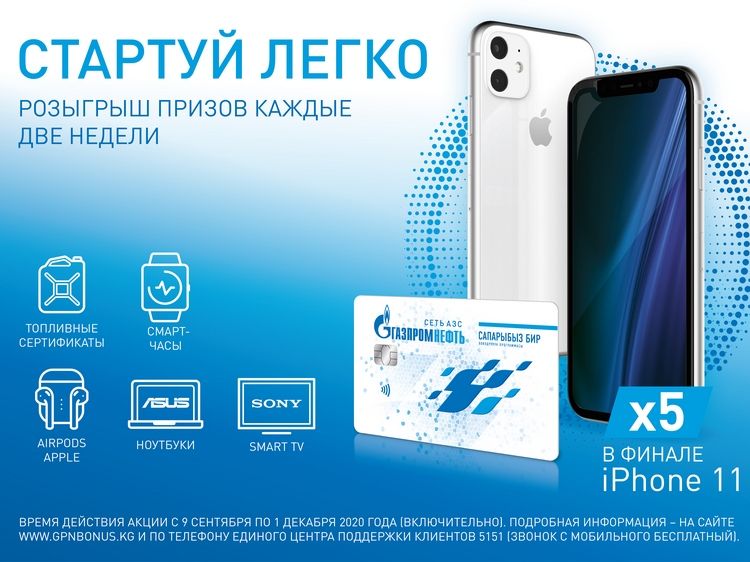 На автозаправочных станциях сети «Газпромнефть» в Кыргызстане запустилась акция «Стартуй легко», участники которой получат возможность выиграть 15 тысяч литров премиального топлива, ноутбуки, телевизоры, Apple Airpods и пять iPhone 11.