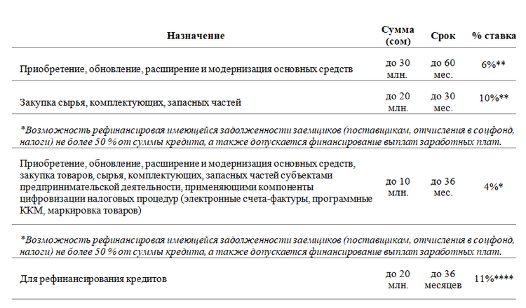 — кредит могут получить индивидуальные предприниматели, малые, средние, крупные предприниматели юридические лица, надлежащим образом зарегистрированные во всех государственных органах Кыргызской Республики, включая Государственную налоговую службу при правительстве Кыргызской Республики и Социальный фонд Кыргызской Республики.