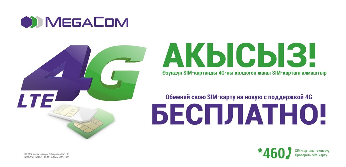 Вы можете проверить, поддерживают ли ваше мобильное устройство и SIM-карта работу в сети 4G, набрав бесплатную команду *460. В случае если система ответит: «Замените SIM-карту», обратитесь в ближайший Центр продаж и обслуживания или Фирменный салон компании MegaCom, где вам бесплатно обменяют вашу SIM-карту на новую - формата 4G LTE.