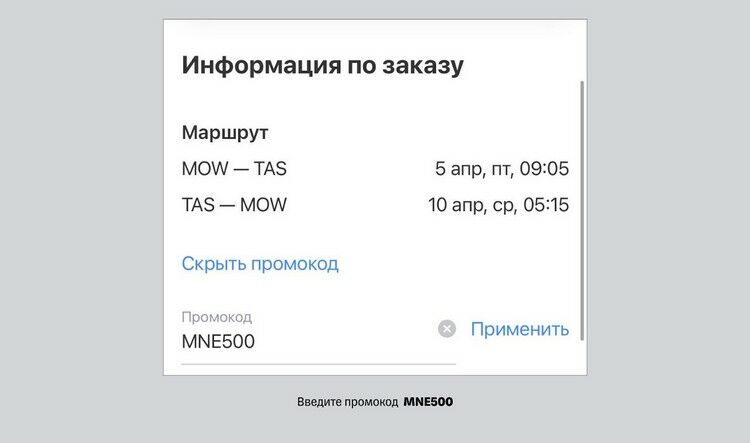 Введите промокод MNE500. Ваш авиабилет станет на 500 рублей дешевле. Промокод действует только на полеты из России в Кыргызстан и обратно.
