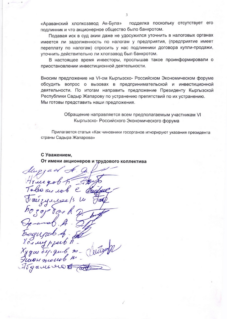 Коллектив и юристы ОАО «Араванский хлопкозавод «Ак-Була», где акционерами являются 112 человек, в том числе граждане Кыргызстана и Российской Федерации, продолжают борьбу за свое право просто работать и приносить пользу стране. Они направили открытое обращение участникам VI Кыргызско- Российского экономического форума, который сегодня, 11 сентября, открывается на Иссык-Куле: