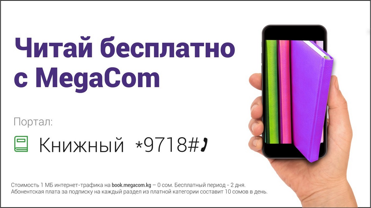 Оформите подписку на book.megacom.kg, набрав команду *9718#, и выбирайте любые интересующие вас книги из обширного каталога. При этом интернет-трафик в сети MegaСom при пользовании порталом совершенно бесплатный.