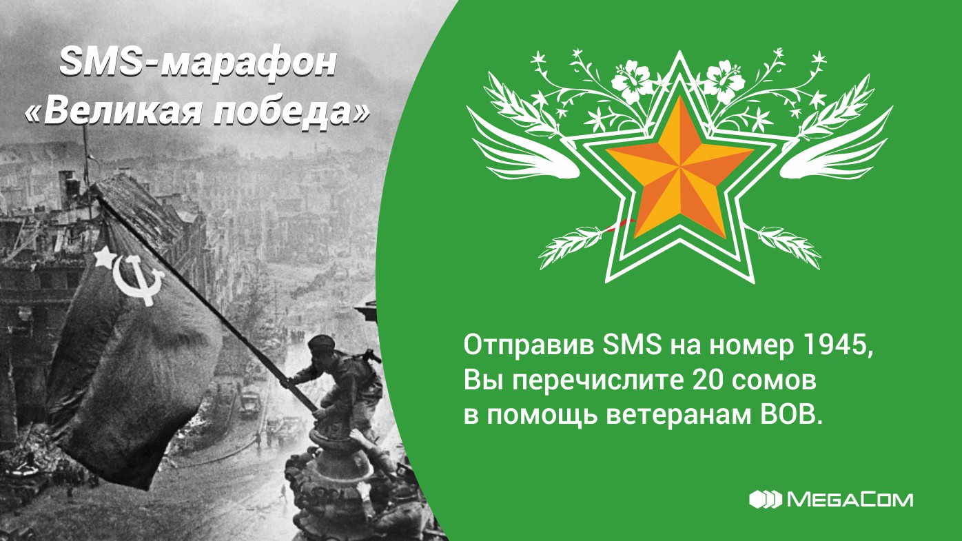 Пятый год подряд мобильный оператор проводит данный SMS-марафон. Благодаря отзывчивости и неравнодушию абонентов MegaCom ежегодно удается собрать значительные денежные средства, которые равномерно распределяются среди героев войны согласно списку, предоставляемому Государственным комитетом по делам обороны Кыргызской Республики Министерства обороны КР. Например, в 2015 году на короткий номер 1945 абоненты компании прислали рекордное количество SMS (более пятидесяти тысяч) и в результате оказали помощь ветеранам на сумму 924 068 сомов после вычета налогов. Сотрудники компании MegaCom произвели передачу денежных средств лично в руки ветеранам. Отчеты об этом обязательно публикуются в СМИ и на официальном сайте компании.