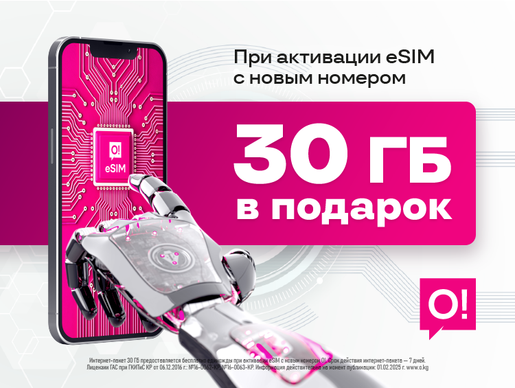Интернет-пакет 30 ГБ предоставляется один раз при активации eSIM с новым номером О!. Срок действия интернет-пакета — семь дней. Лицензии ГАС при ГКИТиС КР: ООО «НУР Телеком» № 16-0062-КР и 16-0063-КР от 06.12.2016. Подробнее об этой и других акциях О! на официальном сайте o.kg.